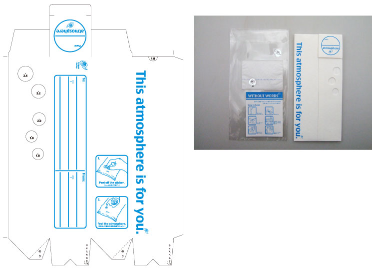 旅先の雰囲気・空気をありのまま送る手紙。採取した空気を付属のビニール袋に入れ、箱に納める。何の変哲もない空気が「送る」という行為によって、たちまち貴重で、臨場感いっぱいのプレゼントへ変化する。受け取った人は、袋から溢れる空気を肌で感じることで、まるで自分がその旅先へ行った気分に浸ることはできる。